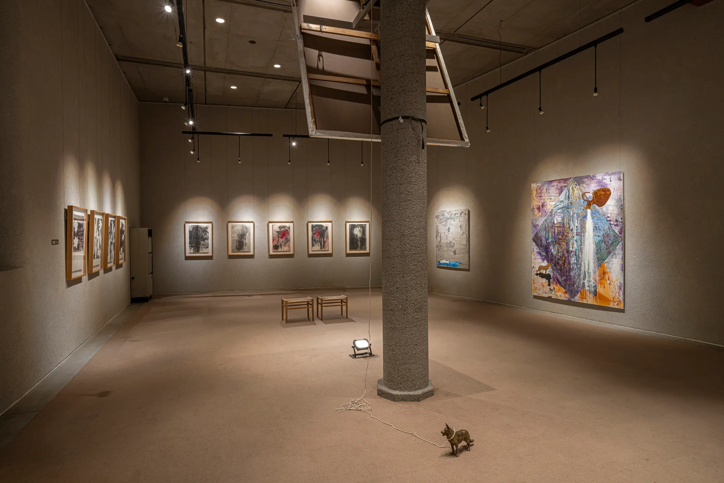 抱擁とは美術館内に常設されたジャコモ・マンズー作品《恋人たち》の姿形をお借りした。 元々は高尾校舎1号館のエントランスフロアにあったこの像に私が出会ったのは、18歳の受験の時とその後一浪して合格した時だったが、深く関わるようになったのは1991年31歳の時に非常勤講師で勤務するようになってからだ。 その2年後に高尾校舎から現校舎の美術館内に移設されたわけだが、44歳で専任になり65歳で定年を迎える私としては人生の半分以上をこの大学と関わって来たわけだ。 しかしここを去る今の感慨は抱擁ばかりではなく交錯感も強く感じているのも事実だ。大学人として十二分に大学と対峙して来たのか、画家として存分に活動出来たのか甚だ疑問がある。良いこともあったが嫌なこともたくさんあった。 マンズーの恋人たちのように情熱を持って抱擁し合うことなどとても出来ない存在が勤務校である本学だったのかもと今さらながら感じる。 「抱擁と錯綜と犬/ Hugs, confusion and dogs」とは、私の捻れた本学との距離感そのものであり、「犬」とは実は私のことだ。 しかし今さらながらにこの30数年、専任になり20年余を振り返ると確実に自分の人生の大きな部分を占めていることはたしかで、本学で出会ったすべての皆さんには錯綜しながらも感謝したいと思う。